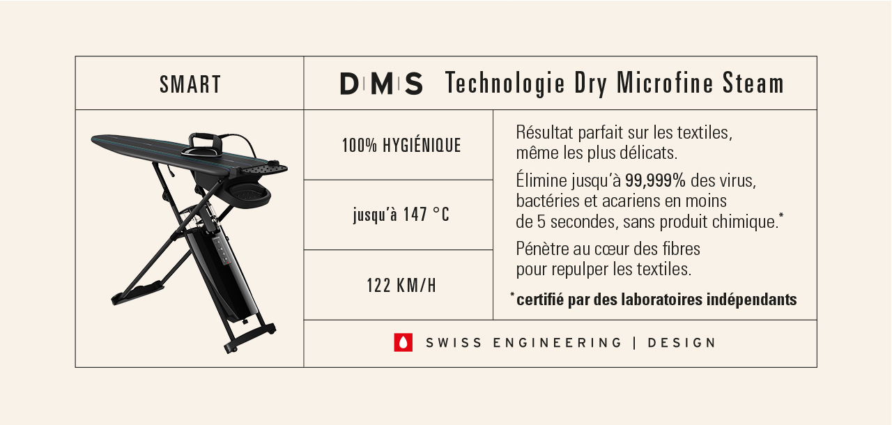 Laurastar a mis au point une vapeur puissante et exclusive : la Dry Microfine Steam. La DMS vous assure un repassage parfait sans effort, un respect de toutes les matières et une désinfection au cœur des fibres permettant d'éliminer les microbes résistants aux lavages à 40 °C et de réduire les odeurs.